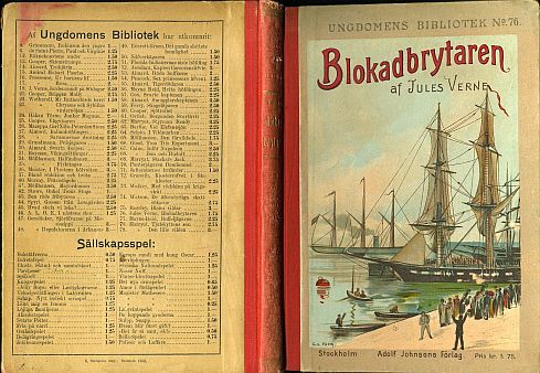 3. Blokadbrytaren. 1903: Blokadbrytaren. Johan Jönssons Boktryckeriaktiebolag, Norrköping. Övers. N. Nisbeth. Åtta illustrationer av T. Ödberg. 98 sidor. Ungdomens Bibliotek No.76. Originalkartonnerad med röd klotrygg. Omslagsillustration av G L Fürth. Pris 1:75. Version 1: Prisuppgift på främre omslaget, förteckning över seriens böcker t o m nr 79 på bakre omslaget, samt förteckning över sällskapsspel. Ryggtext i guldtryck. Version 2: Saknar prisuppgift på främre omslaget, förteckning på bakre omslaget över seriens böcker t o m nr 130. Ryggtitel saknas. Denne version må stamme fra ca. 1905, men der er tale om samme udgave, blot med forskellig reklame påklistret bagsiden.