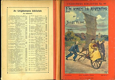 1898: Jorden rundt på 80 dagar. Fritt efter Jules Verne af Richard Krone. Äfventyrsböcker nr 38. Adolf Johnsons förlag. Johan Jönssons Boktryckeriaktiebolag (f d M W Wallberg & Comp. Boktryckeri), Norrköping 1890. Anonym översättning. 72 sidor. Häftad med omslagsbild i färg. Pris 50 öre. ![]() Det är alltså frågan om två olika översättningar, bägge från tyskan, och den senare, från 1898, starkt förkortad. Omslaget på 1890-utgåvan är detsamma som den danska utgåvan från samma tid från N Hansen & Co’s forlag, och precis som denna innehåller den svenska en tillagd berättelse om hur det gick för Phileas Fogg senare i livet – lyckligt, förstås. Det är intressant med