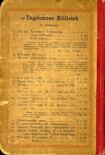 Findes også med blå klotrygg utan ryggtext och bakre omslag helt utan text. . "Godtköps-Romaner" , "Jernvägs-Lektyr" og "Ångbåts-Lektyr". Ad. Johnson udsender en del af sine restoplag som Godtköps-Romaner til en lidt lavere pris end den oprindelige udgave.