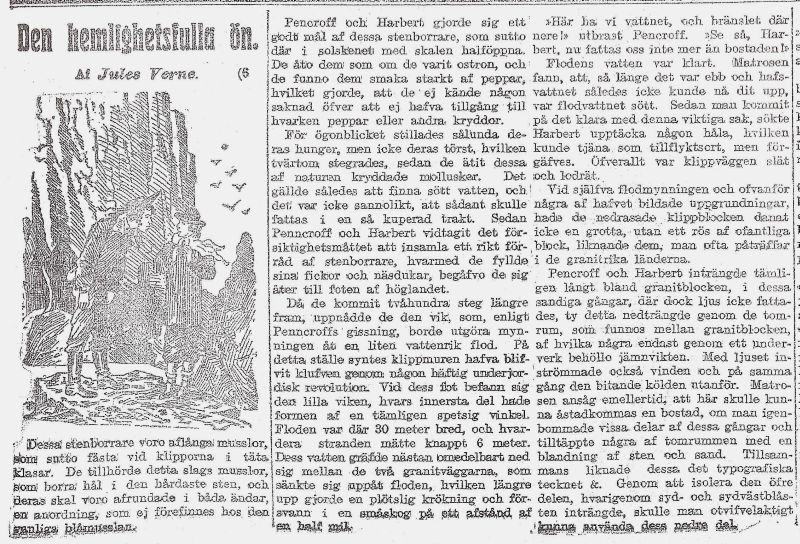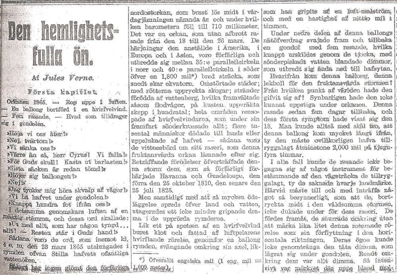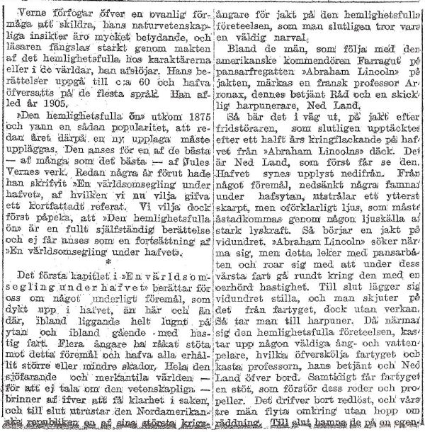 Den 30 januari 1907 införde man en liten artikel om Jules Verne och om den kommande följetongen med en sammanfattning av ”En världsomsegling under hafvet”, vilket man tydligen tyckte att läsarna behövde. I nästa nummer, den 2 februari, började följetongen, som sen fortsatte ända till den 15 augusti 1908. Varje dag trycktes 6-7 spalter nederst på sidan, med annan text på baksidan. Så förhoppningen att finna den i urklippt skick är nog liten!