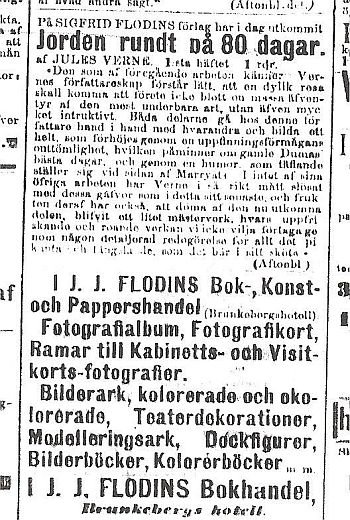 1: 1872-73 (274 s. (120 + 154). 2: ?. 3: 1873 (264 s) Bind fra Lars-Eriks samling. Næsten samme bind kendes fra Hugo Pettersson og Lamm, men her altså Flodin:. så hvad er egentlig et "originalband" ? .Annonce i Dagens Nyheter : Den 23 december 1872 annonserade Sigfrid Flodins förlag att första häftet av ”Jorden Rundt på 80 dagar” hade kommit ut. Priset var 1 Rdr. Andra häftet kom som bekant ut först efter årskiftet. Boken säljs i brodern J J Flodins bokhandel.