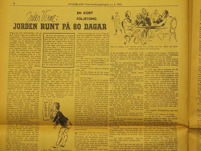 Jorden runt på 80 dagar. Aftonbladets Halvvecko-upplaga den 20 januari - 21 februari 1940. Löpande text, ungefär en helsida per nummer. Illustrerad av signaturen Rinaldo. Översättare okänd.