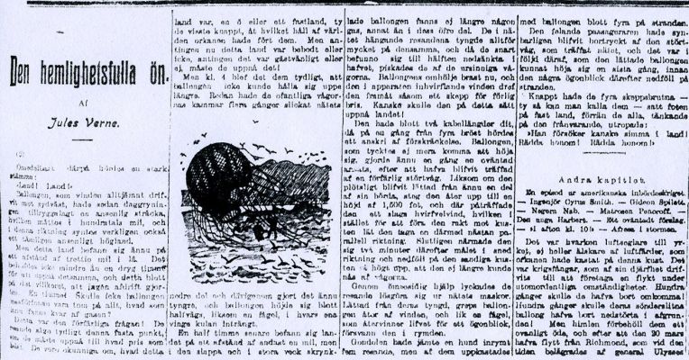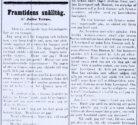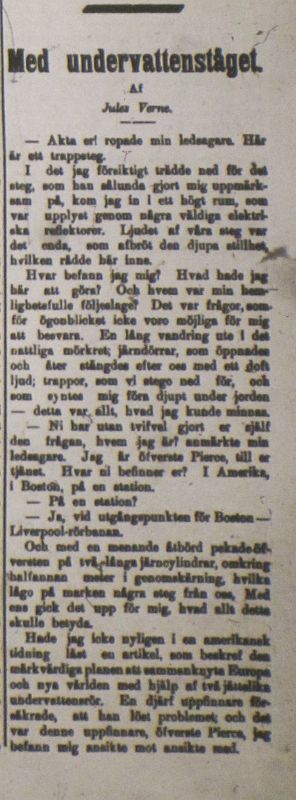 | Den efterfølgende oversigt må antages at være meget mangelfuld. Supplerende oplysninger modtages med glæde. Aftonbladet. 30.01.1907 - 15.08.1908 . Aftonbladets Half-veckoupplaga införde ”Den hemlighetsfulla ön 1907-1908. Så det är mera av en veckotidning, som gavs ut två gånger i veckan, men formatet är dagstidning och pappret också dagstidning. Se indledende artikel om JV samt uddrag af to afsnit: Aftonbladet Tidigare har jag berättat om fyndet av "Den hemlighetsfulla ön" som följetong i Aftonbladets Halfvecko-upplaga, där den trycktes den 30 januari 1907 till den 15 augusti 1908, med enkla illustrationer insprängda i texten. Aftonbladet-"koncernen" ägde även tidningen Dagen mellan åren 1896 och 1913. En del material användes i båda tidningarna, och så skedde även med Verne-följetongen. Eftersom Dagen utkom varje dag, så gick det fortare att ge ut hela följetongen: den trycktes från den 13 februari 1907 till och med den 18 juli samma år. Samma illustrationer, och "ensidig" utan sidnumrering, precis som i Halfvecko-upplagan. ... ![]() Ännu ett fynd av "Framtidens snälltåg"! Denna gång i Östgöta-Correspondenten den 22 april 1905. Inte samma översättning som i Svenska Tribunen. ![]() . En följetong. ”En världsomsegling under havet” trycktes i Arbetar-Tidningen 1955. Tidningen trycktes av Västan AB i Göteborg. Följetongen startade den 20 september och var inte avslutad vid årsskiftet – slutdatum ej känt. Den 31 december kom det 87:e avsnittet. .