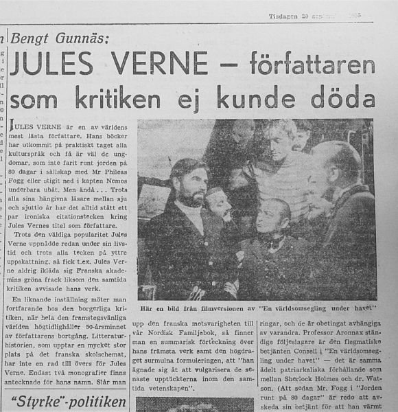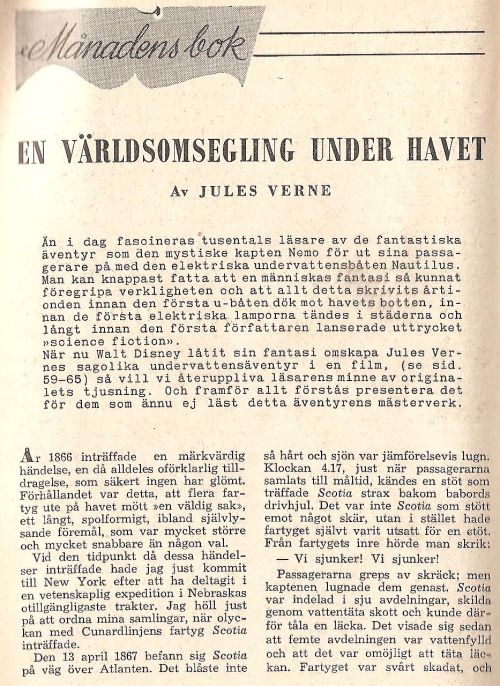 Tidsskriftet ALT för alla. ”En världsomsegling under havet” – visserligen förkortad på bästa Reader’s Digest-manér. I tidskriften ALLT för alla, nr 9, september 1954 och berättar hela historien på sidorna 76-100. ![]() ![]() Jules Verne-magasinet. Se også om Jules Verne-magasinet under forlaget Lundwall Fakta & fantasi.