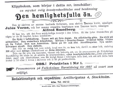 Det är ju väl känt att (förlaget) Folkskolans Barntidning också gav ut Jules Verne-romaner: Tsarens kurir, tryckt 1904 med nya upplagor 1907, 1917 och 1928, samt Den hemlighetsfulla ön, tryckt 1907 med nya upplagor 1912 och 1929, allt enligt vad som uppges i Uno Asplunds Jules Verne-bok. Tsarens kurir är ”fritt återgiven” av Alfred Smedberg och illustrerad av Karl Aspelin, och Den hemlighetsfulla ön, likaså fritt berättad av Alfred Smedberg, är illustrerad av Brita Ellström. Aplund anger att Tsarens kurir skulle vara utgiven i häften 1904 och att det skulle finnas två upplagor av Den hemlighetsfulla ön från 1907. Detta är dock något slags missförstånd, som kanske kan förklaras med nedanstående.