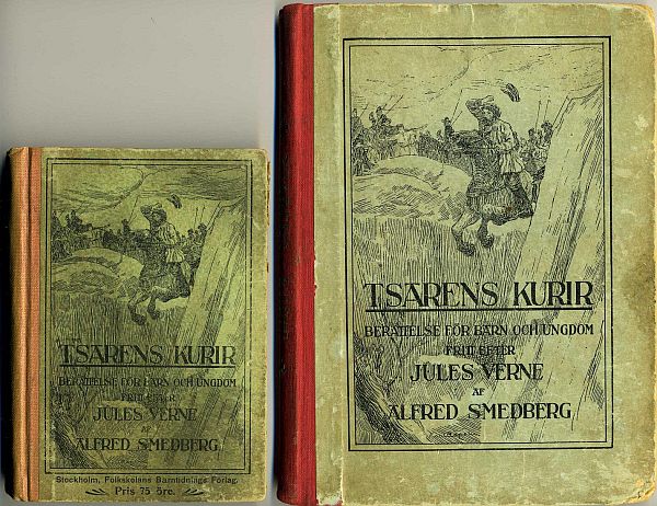 Tzaren 1904 Det som inte uppmärksammats är att dessa bägge berättelser ursprungligen utgavs som urklippsföljetonger i tidskriften Folkskolans barntidning! Tsarens kurir gavs ut under större delen av året med (vanligtvis) två blad i vartannat nummer som en vanlig urklippsföljetong: varje blad bestod av åtta sidor, som veks ihop till ett ark. I nummer 33, i slutet av året, anmäles så att det finns pärmar till följetongen att köpa. En pärm kostade 25 öre, inklusive postporto. Ingenting anges om pärmens utseende, men det ex jag har består av en röd, blindpressad klotpärm med ryggtext i guld i format ca 9x13 cm. I nummer 30 från november 1905 meddelas sedan att Tsarens kurir, ”som så mycket efterfrågats”, nu finns att köpa i bokform, inbunden till priset 60 öre. Jag har inte sett detta band, men jag tror att det var samma halvklotband med påklistrad pärmbild, som finns till 1907 års upplaga, vilken torde vara identisk med 1905-utgåvan, sånär som på tryckåret och uppgift om andra upplagan på bakre pärmen (1907 är priset dock 75 öre).