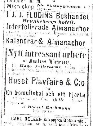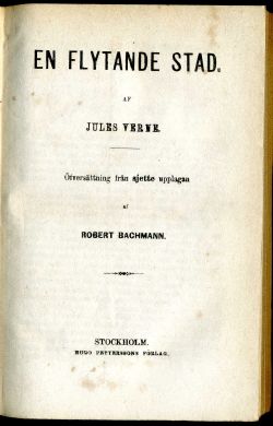 ![]() 5. En flytande stad. Översättning från sjette upplagan av Robert Bachmann. Hugo Petterssons förlag. Bergström & Lindroth, Stockholm 1873. 165 sidor. Häftad, ca 178x118 mm. Häftesomslag okända. ![]() Annonce i Dagens Nyheter: Den 22 december 1873 hade Hugo