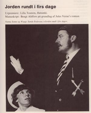 I hovedrollerne: Phileas Fogg: Waage Sandø PedersenPassepartout: Benny Bjerregaard Aouda: Nanna Sonne. Svend Kragh-Jacobsen: "Teaterårbogen 1971-72", Gjellerup 1973.: