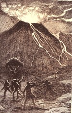 1871-1945, dansk maler og grafiker. Weilbach . Han tegner til Jespersens lille udgave af Den hemmelighedsfulde Ø i 1900 4 illustrationer, der nærmest må betegnes som kopier efter Férats originaler. Da Jespersen i 1922 udsender anden udgave af deres Verneserie, gentegnes illustrationerne lidt sjusket og groft af G. Tenggreen. Vist er her det dramatiske vulkanudbrud i hhv. Krauses version, Tenggreens