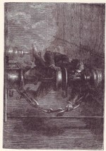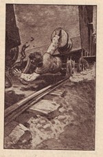 tegning, hvor Passepartout i farten løsner lokomotivet fra resten