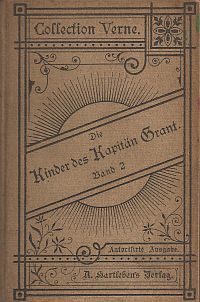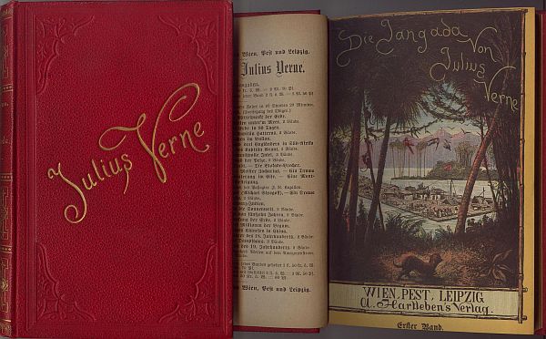 ![]() "Die Jangada" 1. og 2. bind inkl. "Von Rotterdam nach Kopenhagen am Bord der Dampfyacht "Saint Michel"" af Paul Verne. 1882. Det er det lille format i rød helshirting med forsidebillederne (2 ens) indklæbet. ![]() "Das Land der Pelze" 1. bind. Det er bind XVII i serien "Julius Vernes Schriften" 3. oplag 1879. 284 s. Bogen har tidligere været på et bibliotek i Würzburg. ![]() ![]() ![]() En lille heftet Hartleben-udgave: "Der grüne Strahl".