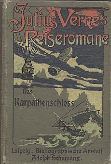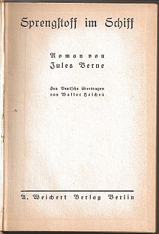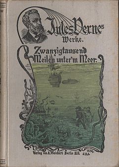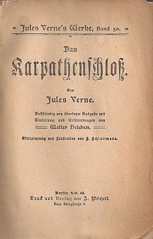 ![]() . "Zwanzigtausend Meilen unter´m Meer" 1.-2., Verlag von A, Weichert, Berlin u. år (1901-09). . ![]() . ![]() . Serien "Jules Vernes Werke" Band 6-7. 1 ill. i hvert bind af R. Grünberg. Oversat af Paul Heichen. 180 s. + 156 s. Grå helshirting med tryk i sort og farve. . "Das Karpathenschloss". Druck und Verlag von A. Weichert, Berlin u. år. (1901-09). . ![]() . Serien "Jules Vernes Werke" Band 50. Omslagstegning af J. Schlattmann. Oversat af Walter Heichen. 160 s. Heftet med omslagsill. i grønt. Weichert-forlaget var vel - sammen med andre - afløser og konkurrent til Hartlebens udgaver med den lange serie. Indbindingen er i stil tydeligvis "art nouveau", som passer med det første årti af det 20. årh. Nogle af de senere Weichert-udgaver: "Fünf Wochen im Ballon". Med s/h tegninger og indklæbede farvetryk af M. Wulff. A. Weichert, Verlag, Berlin. U. år (1911). Karton med shirtingsryg.