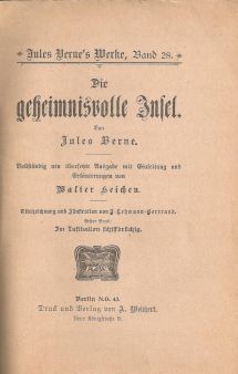”Die geheimnisvolle Insel II”, A. Weichert Verlag, Berlin u. år (1901-09) . Serien ”Jules Vernes Werke Band 29”. 1 illustration. 188 s. + 1 s. indholdsfort. Forlagets heftede udgave. .