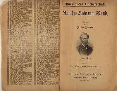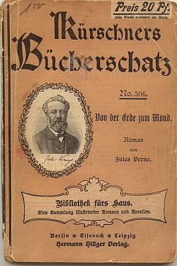 inform you. ![]() Hermann Hiller Verlag Von der Erde zum Mond" i serien "Kürschners Bücherschatz" med nummeret 306. Den er udgivet af Herrmenn Hiller Verlag, Berlin, Eisenach, Leipzig udedatering. Af forordet om Jules Ve fremgår, at han er nær 75 år gammel, så bogen er fra 1902/03. Den er heftet og har nærmest billigbogsudseende og kostede "kun" 20 pfennig. Der er dog illustrationer i jugendstil af tysk kunstner: "W. Roegge". Den er på 124 s. Af reklame i bogen for serien fremgår, at nr. 210-11 i serien er "Reise um