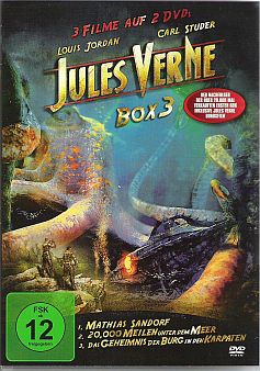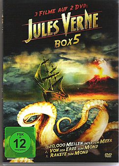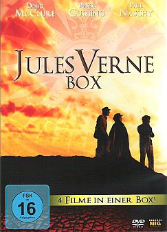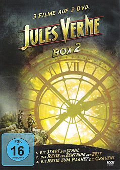 | Foruden enkelte film findes der en del filmboxe og andre samlinger af Vernefilm. følgende er af tysk oprindelse. Filmbox 1. Indeholder fire film: Phantastische Reise zum Mittelpunkt der Erde , GB/Spanien 1977 (Rejsen til jordens indre). Das geheimnis der Monsterinsel, USA/Spanien 1981 (Robinsonskolen) Die Teufel der Meere, USA/Spanien 1981 (Kaptajnen på 15 år) Tauchfart des Grauens , USA/GB 1977 (om søgning efter Atlantis, ikke genkendelig JV). ![]() Filmbox 2 (2010): Indeholder 3 film: Die Stadt aus Stahl, CSSR 1978 (Begums millioner) Die Reise ins Zentrum der Zeit (om en tidsmaskinerejse, ikke Jules Verne) Die Reise zum Planet des grauens, USA 1982 (Den hemmelighedsfulde ø, hvor øen er erstattet med en fjern planet) ![]() Filmbox 3 (2010). Indeholder 3 film: Mathias Sandorf , Fr/It/Sp, 1962 20.000 Meilen unter dem Meer , USA, 1916 (også dele af Den hemmelighedsfulde ø). Das Geheimnis der Burg in den Karpaten, CSSR 1981 ![]() Filmbox 5 (2012). Indeholder 3 film: 20.000 Meilen unter dem Meer, TV serie, USA 1997. Von der Erde zum Mond, USA 1958 Rakete zum Mond, USA 1950 (fantasier inden Sputnik, ikke JV) ![]() 3 film fra "Les inédits fantastiques": Les indes noires, 1964, Le secret de Wilhelm Storitz, 1967 og Maitre Zacharius, 1973. ![]() |