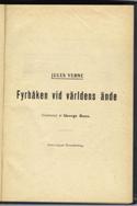 R 63: Fyrtårnet ved verdens ende (Le Phare du bout du monde). Skrevet af Verne 1901. Udgivet 1999. Ændret af sønnen Michel Verne og udgivet i 1905. Tre fyrmestre (Vasquez, Felipe og Moriz) bliver ladt tilbage for at passe fyret på Staten Island, en ø, der ligger 200 km nordøst for Kap Horn i Atlanterhavet. Uheldigvis er der andre beboere på Staten, en flok pirater (anført af Kongre), som har ventet på en lejlighed til at få fingre i et fartøj, hvorpå de kan forlade øen. De myrder Felipe og Moriz og sætter sig i besiddelse af fyrtårnet. Det er nu op til den eneste overlevende, Vasquez, at holde sig i live til afløsningen kommer tre måneder senere. Nordiske udgaver: Danmark: Fyrtårnet ved verdens ende: Aller (1907), Ungdommens Forlag (1965), eBIBLIOTEKET 1800 (2003). ![]()