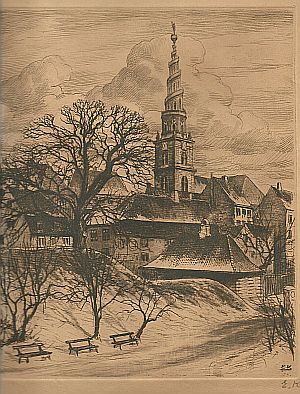 Endnu et kirketårn, denne gang set fra kanalen. Billedet, en radering,
