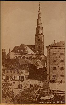 spiralsnoede spir på Vor Frelsers Kirke..Et gammelt postkort, der ud over "vort " tårn viser